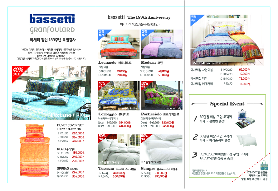 *사은품 증정 기간중 쿠폰(백화점 디엠 및 자체디엠에 포함) 소지고객께 바세티 패션백 증정 "일 별 10개씩 10일간 선착순 증정" (2월8일~17일) -구매 금액대별 사은품 증정 행사 기간중 일정 금액 이상 구입 고객께 사은품 증정 30만원 이상 구입 고객께 바세티 블랑켓 증정 60만원 이상 구입 고객께 바세티 베개솜 세트 증정