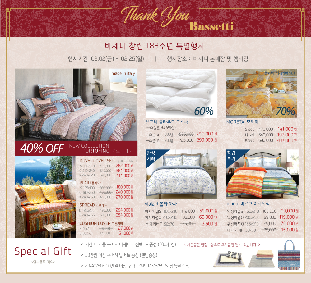 [바세티] 창립 188주년 기념 이벤트 (바세티-포르토피노 40% 할인)