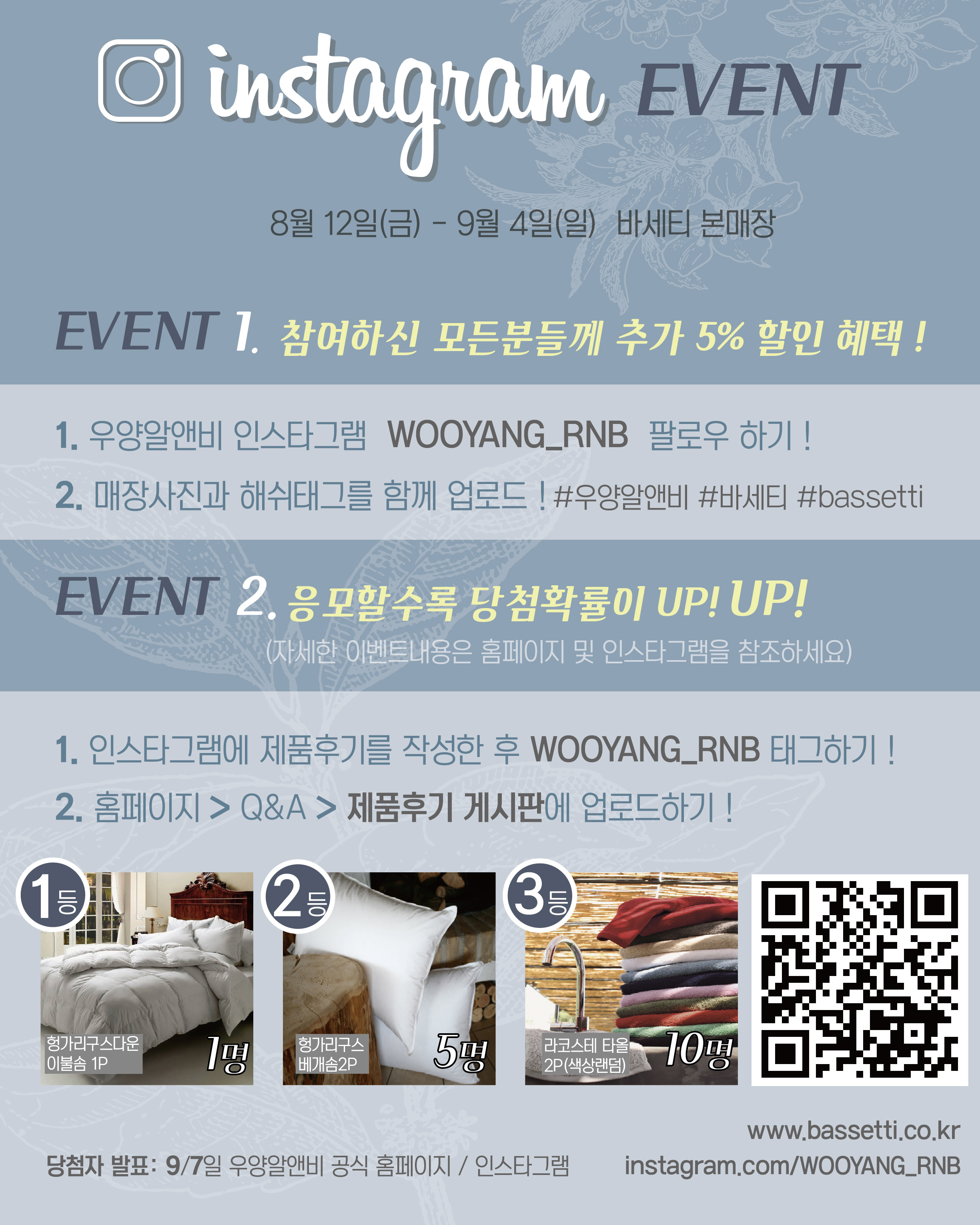 ※이벤트 참여방법※ 1) 행사기간 중 바세티 또는 크리스티매장을 방문하여 우양알앤비 인스타그램계정 (WOOYANG_RNB)를 팔로우하고, 매장사진과 해시태그를 업로드해주세요! ->매장에 방문하여 참여해주신 고객 모두에게 추가5%할인의 혜택을 드립니다. 2) 바세티 또는 크리스티제품을 매장에서 구입 후, 홈페이지->제품후기란 및 개인 인스타그램에 제품후기 및 이미지를 업로드해주세요! ->인스타그램에 업로드할 때, WOOYANG_RNB를 태그해야 이벤트참여 확인이 가능합니다. ->인스타그램과 홈페이지 모두 업로드해주신 고객은 당첨확률이 2배가 됩니다!