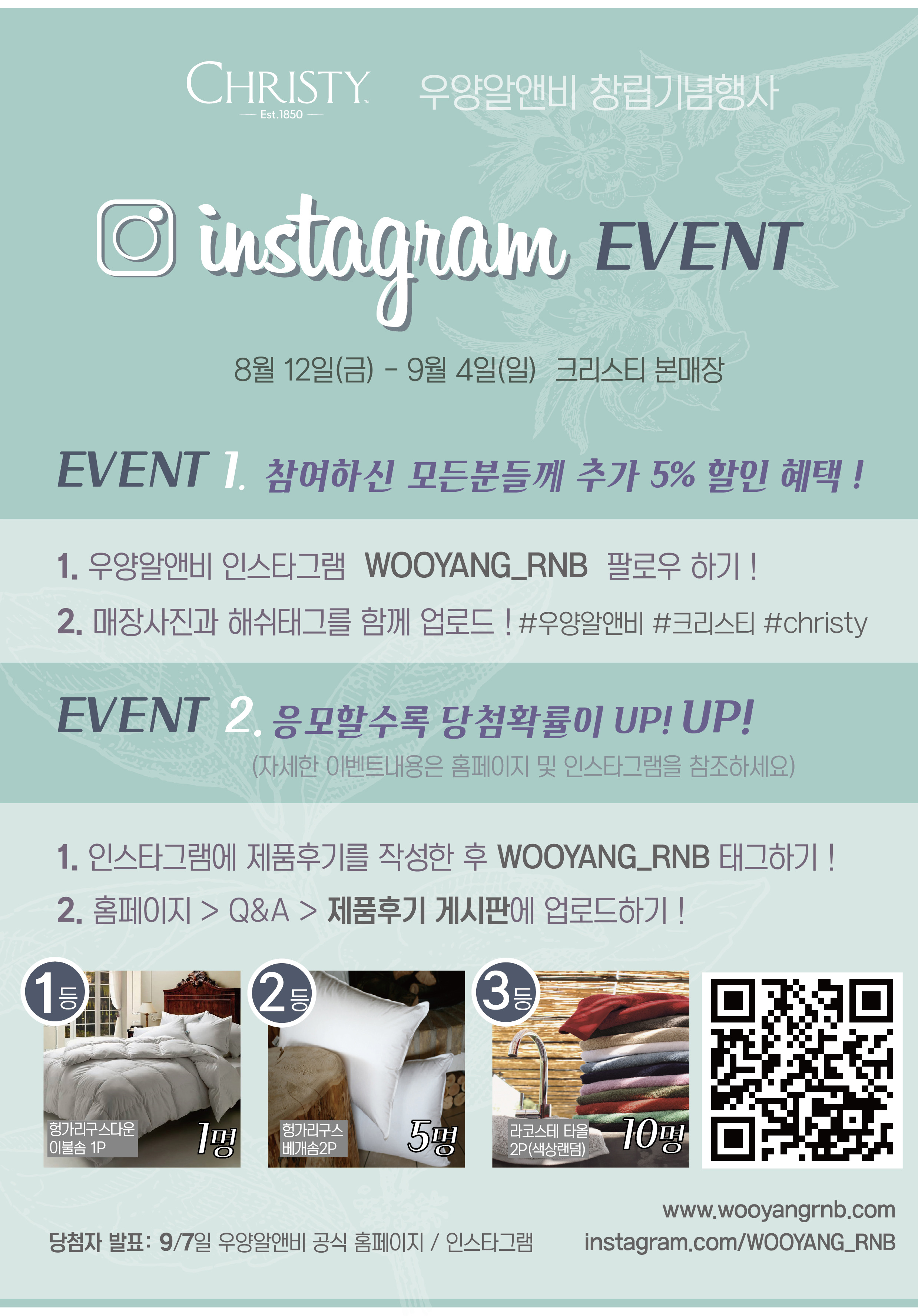 ※이벤트 참여방법※ 1) 행사기간 중 바세티 또는 크리스티매장을 방문하여 우양알앤비 인스타그램계정 (WOOYANG_RNB)를 팔로우하고, 매장사진과 해시태그를 업로드해주세요! ->매장에 방문하여 참여해주신 고객 모두에게 추가5%할인의 혜택을 드립니다. 2) 바세티 또는 크리스티제품을 매장에서 구입 후, 홈페이지->제품후기란 및 개인 인스타그램에 제품후기 및 이미지를 업로드해주세요! ->인스타그램에 업로드할 때, WOOYANG_RNB를 태그해야 이벤트참여 확인이 가능합니다. ->인스타그램과 홈페이지 모두 업로드해주신 고객은 당첨확률이 2배가 됩니다!